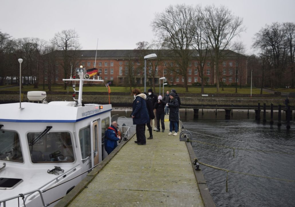 Da der Wasserspiegel so stark gesunken war und der Wind ungünstig auf dem Anleger stand, wurde kurzhand das Anlegemanöver an der Spundwand vom Wiker-Hafen vorgenommen. Keine schlechte Idee! Diese wurde auch von einem anderem Verein aufgegriffen, der ebenfalls zeitgleich die praktische Prüfung auf der Kieler Förde durchführte.