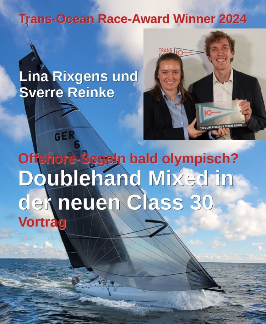 Wir freuen uns am 14. Februar 2025, 20.00 Uhr die Gewinner des TO-Race Awards 2024 Lina Rixgens und Sverre Reinke zu einem Vortrag in Kiel begrüßen zu dürfen. Sie berichten von ihren Erfolgen und Erfahrungen in der Regattasaison 2024 als Doublehanded-Mixed-Team in der neuen Class 30. Diese begann mit einem starken 2. Platz beim Drheam Cup und endete bei der stark besetzten Doublehanded-Offshore-Weltmeisterschaft für Mixed-Teams als Team Germany mit einem siebten Rang. Dazwischen lagen zahlreiche weitere Starts im Team mit ihrem neuen Boot. Wir sind gespannt auch von ihren Plänen für die neue Saison 2025 zu hören.